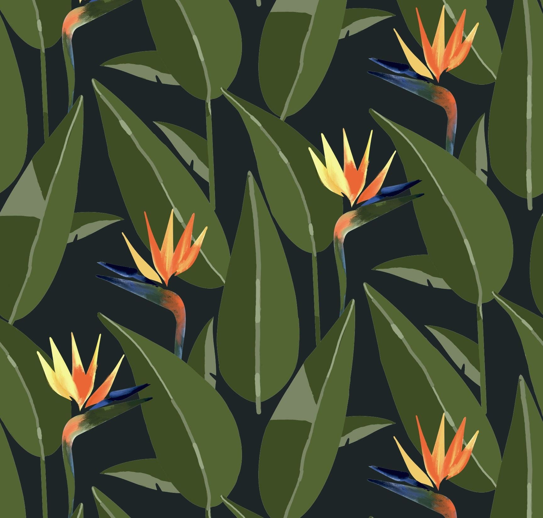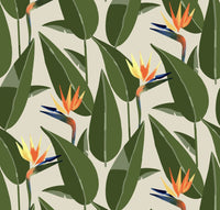 "Birds of Paradise" wallpaper captures the exuberant essence of the tropics with its vibrant and lush depiction of the iconic flower. Bursting with vivid oranges, yellows, and greens, this pattern celebrates the botanical wonder known for its resemblance to a bird in flight. The lively floral display set against a neutral backdrop transforms any room into a bright, inviting paradise. Each stroke and color is thoughtfully placed to emulate the natural beauty and bold spirit of these flowers, making it a statement piece that's full of life. Adorn your walls with the "Birds of Paradise" pattern and invite the spirit of tropical flora into your home. It's perfect for anyone looking to infuse their space with the warmth and vitality of a sun-drenched garden, creating a feeling of a perpetual summer bloom.